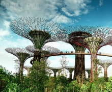 Тропический парк "Сады у залива" (Gardens by the Bay) в Сингапуре поражает футуристическими пейзажами. 18 гигантских "деревьев" высотой от 25 до 50 метров с наступлением темноты превращаются в светящийся лес, будто бы спрятанный на берегу залива. "Сады у залива" - вертикальный парк с тропическими ползущими растениями, орхидеями и редкими видами лиан и папоротников. Кроны "деревьев", увитые цветами и зеленью, состоят из железных прутьев и бетона и освещаются разноцветными огнями. Между лесными конструкциями сооружены мосты и надземные переходы, с которых можно любоваться необычной рощей.